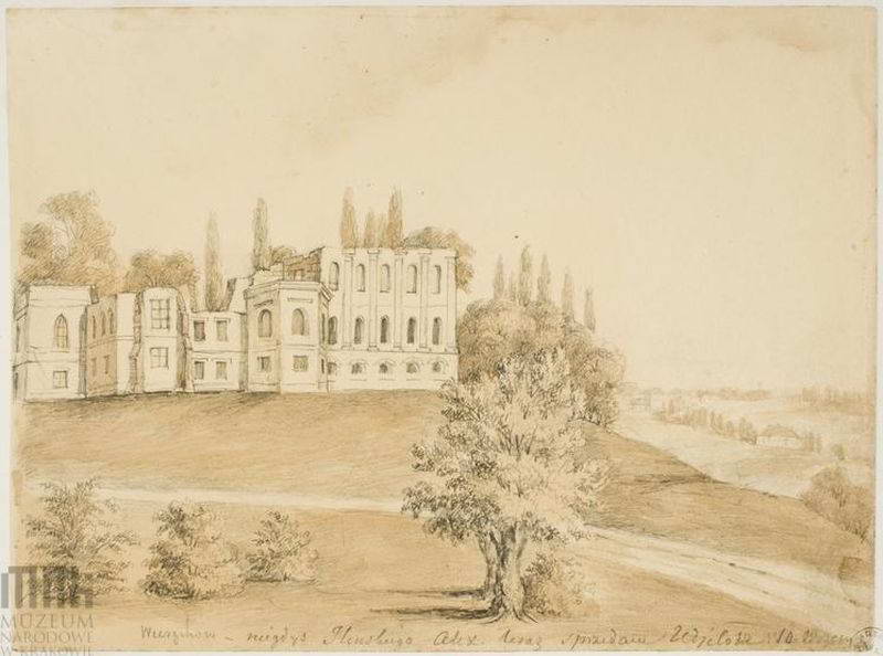 Ruiny zamku i pałac Ilińskich. Widok elewacji zamkowej. 1862 – 1876. Dat.: 10 Września. Napis: Wierzchów – niegdyś Ilińskiego Alex. teraz sprzedana Udjełom [?]; napis na podkładzie: Gub. Wołyńska Wierzchów, – ruiny zamku. Rys. ołówkiem podmalowany sepią, 18,4x24,6. III-r.a. 4285 (Teka Wołyń). [Katalog rysunków architektonicznych ze zbiorów Muzeum narodowego w Krakowie. 1. Rysunki Napoleona Ordy / Opracowały Zofia Kucielska i Zofia Tobiaszowa. – Warszawa: Państwowe wydawnictwo naukowe, 1975, Nr. 810]