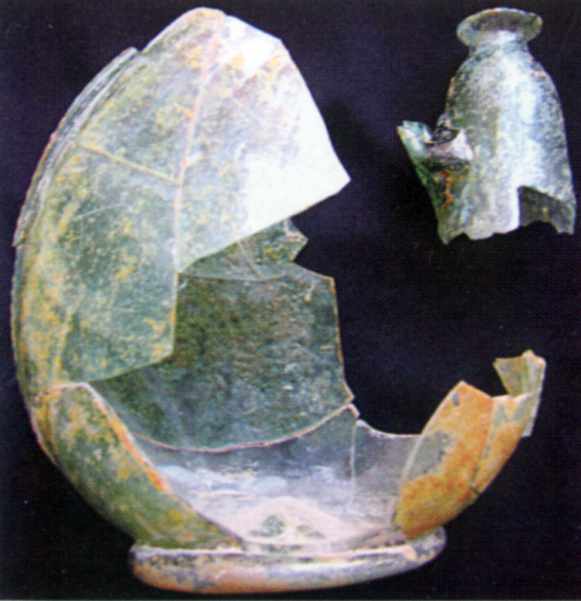 Рештки скляного посуду: пласка пляшка-штоф з Верхнього Салтова (16:16 см), флакон з-під Вільшани (7,5:4,5 см). Розкопки В.В.Колоди.
