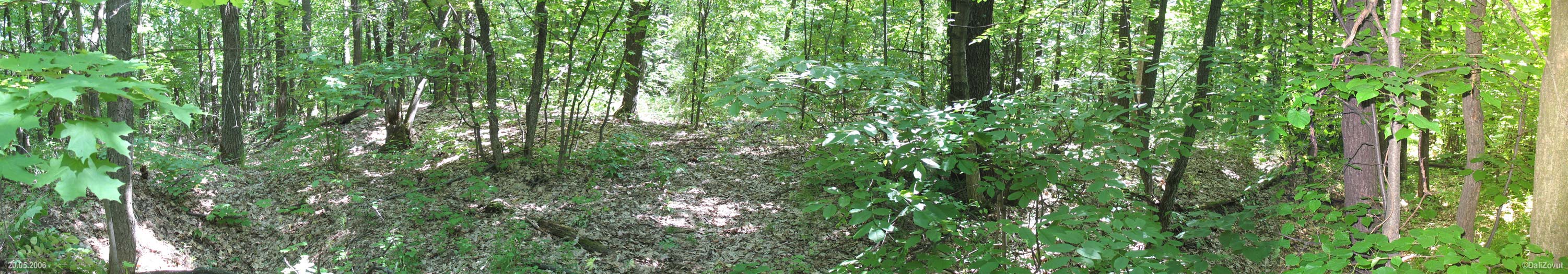 Восточный склон Караванского городища, створ ворот. Слева и справа видны остатки защитного рваРозмір зображення: 3002:525 піксел 20 травня 2006 р.