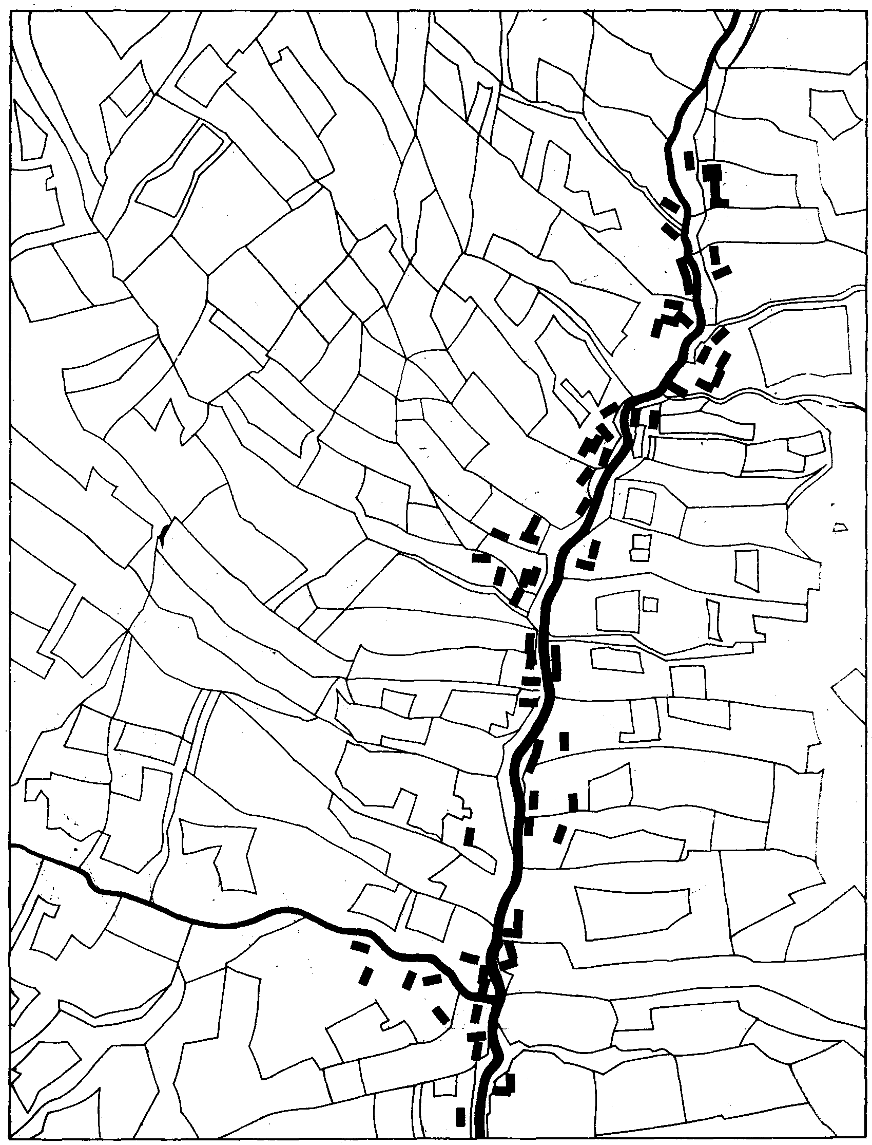 Яскравим прикладом ланцюгового поселення є села Верхній і Нижній Студений Міжгірського р-ну, Зубриця, Майдан, Рибник Дрогобицького р-ну. Тут поселення тягнуться довгим ланцюгом вздовж звивистих річки і дороги, що прилягає до річки, забудова йде почергово то з одного, то з другого боку річки. Частково забудова тягнеться і вздовж потічків, які впадають у ріку. Ці поселення залишились майже незмінними, хіба що трохи густішою стала забудова вздовж ріки. Подібна форма поселень характерна і для інших сіл, розташованих у вузьких міжгірських долинах. Ланцюгова форма поселень, яка на Бойківщині, Лемківщині та їх пограниччях була переважаючою, у чистому вигляді у другій половині XIX ст. зустрічалася нечасто, іноді поєднувалася з розкиданою формою, а зрідка в цей час уже утворювались вулиці.