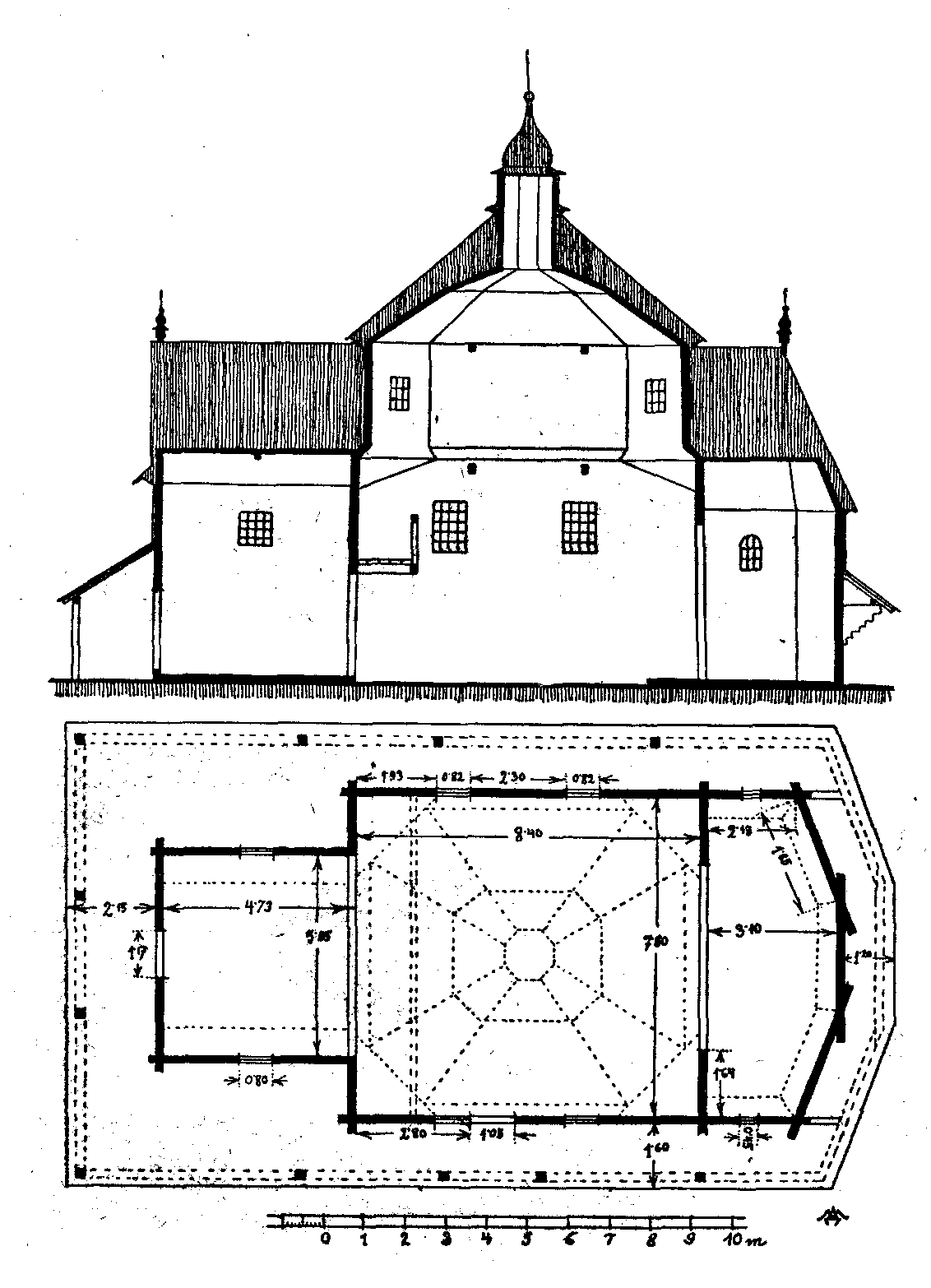 Поздовжній переріз і планРозмір зображення: 1132:1566 піксел Церква 1790 р. (дерев.). Джерело: Драган М. Українські деревляні церкви. – Льв.: 1937 р., т. 2, с. 44. |