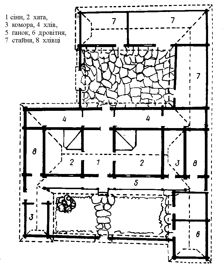1 – сіни, 2 – хата, 3 – комора, 4 – хлів, 5 – ґанок, 6 – дровітня, 7 – стайня, 8 – хлівці.