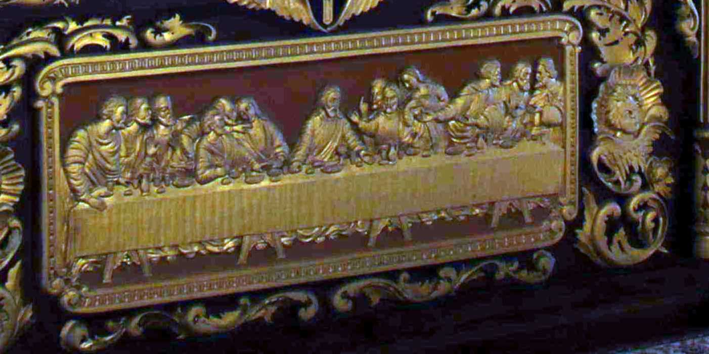 Таємна вечеряРозмір зображення: 1402:701 піксел Рельєф на чільному боці престола. Фото Зенона Боровця і Богдана Тхора, 22 липня 2016 р. |