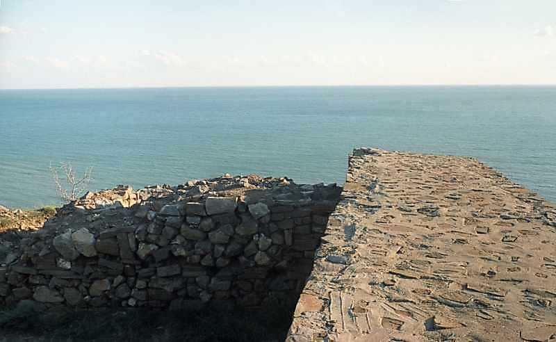 2002 р. Фрагменти південного та західного (праворуч) мурів на тлі моря. Вигляд з півночіРозмір зображення: 800:492 піксел 2002 р. 17 вересня. Фото М.І.Жарких. Негатека, № 954-10. |