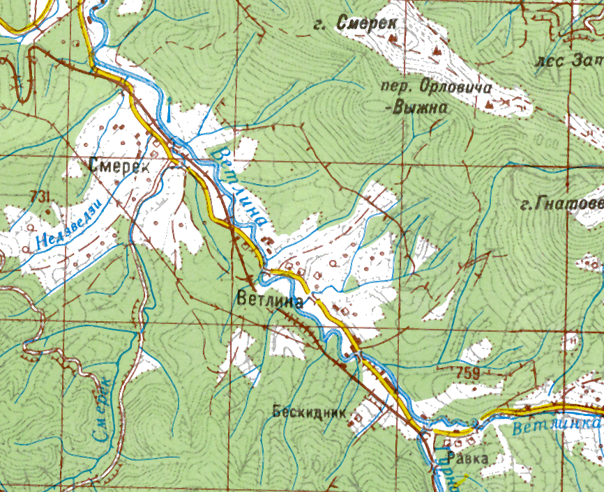 КартаРозмір зображення: 866:706 піксел Карта Київської військово-картографічної фабрики, масштаб 1:100000, аркуш 125, друк 2001 р. (за матеріалами 2000 р.). |
