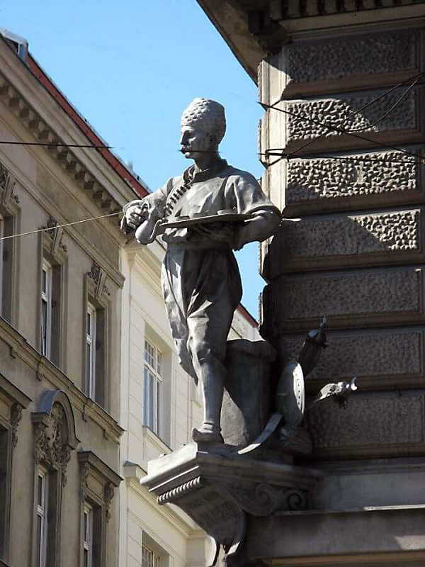 Скульптура роботи Емануеля Пендля встановлена у 1885 р. (Kolschitzky Gasse 2-4, Ecke Favoritenstraße 64, Wien-Wieden).