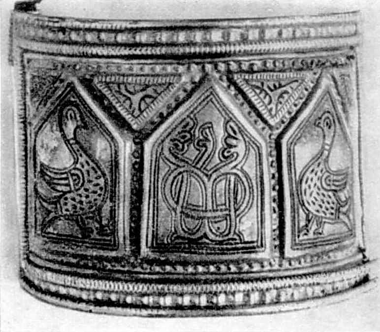 Друга стулкаРозмір зображення: 772:674 піксел Срібний пластинчастий браслет з черню з с. Вікторова Івано-Франківської обл. 13 ст. Львівський історичний музей. Джерело: Історія українського мистецтва. – К.: Наукова думка, 1966 р., т. 1, с. 389. |