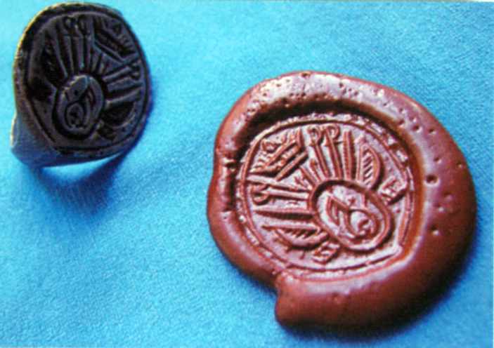 Перстень-печаткаРозмір зображення: 703:496 піксел Перстень-печатка з ненобілітованим гербом (мідний сплав); Вільшани, кінець XVII – XVIII ст. (2,5: 2,2 см). Джерело: Археологія Слобідської України козацької доби: буклет. – Хк.: 2005 (?) р. |