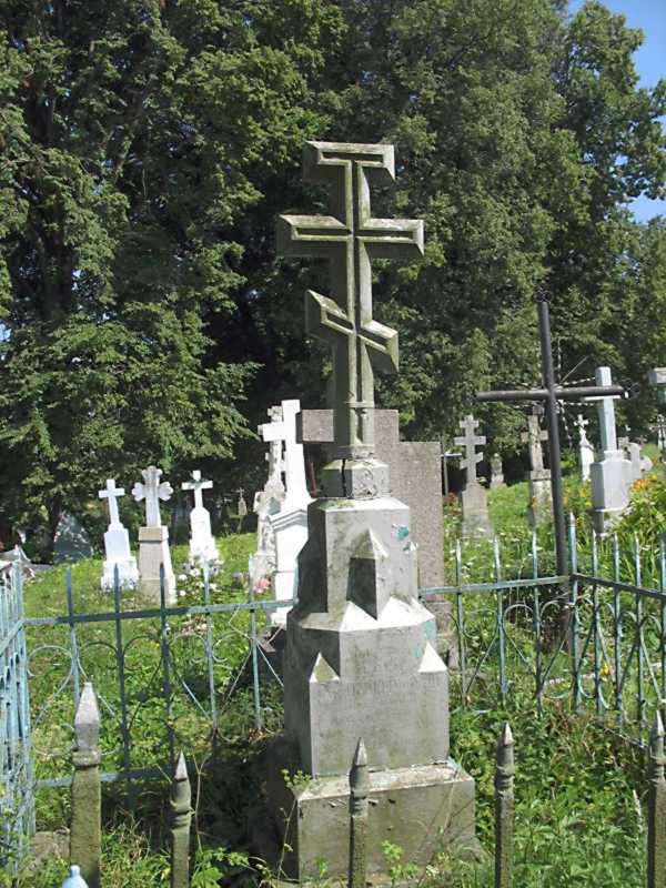 7-кінцевий надгробний хрестРозмір зображення: 600:800 піксел Фото Зенона Боровця і Богдана Тхора, 8 серпня 2008 р. Напис не читається. |
