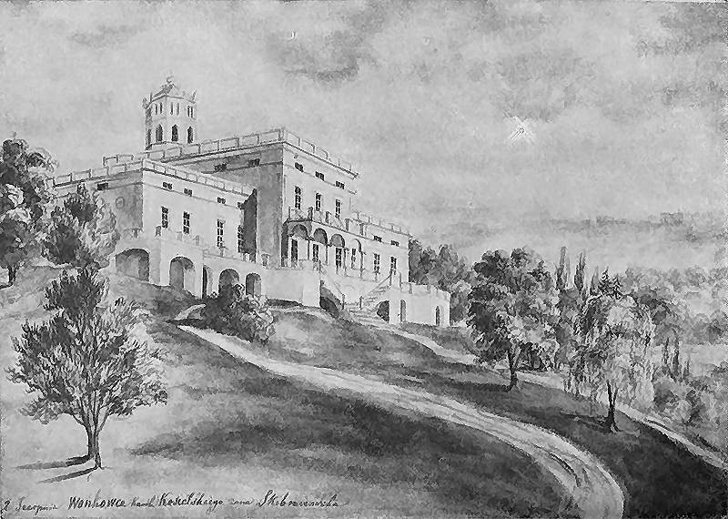 Pałac Kosielskich. Widok od strony ogrodu. Pałac wysoko podpiwniczony, z obiegającym elewację tarasemwspartym na arkadach oraz zewnętrznymi schodami. Dat.: 2 Sierpnia. Napis: Wońkowce Karola Kosielskiego żona Skibniewska; Napis na podkładzie: Wońkowce, – pałac Podole. 1871-1873. Rys. ołówkiem podmalowany akwarelą. 19,5 x 28,3 cm. Muzeum Narodowe, Kraków. III-r.a. 3052. (Teka Podole). [Katalog rysunków architektonicznych ze zbiorów Muzeum narodowego w Krakowie. 1. Rysunki Napoleona Ordy / Opracowały Zofia Kucielska i Zofia Tobiaszowa. – Warszawa: Państwowe wydawnictwo naukowe, 1975, Nr. 839]