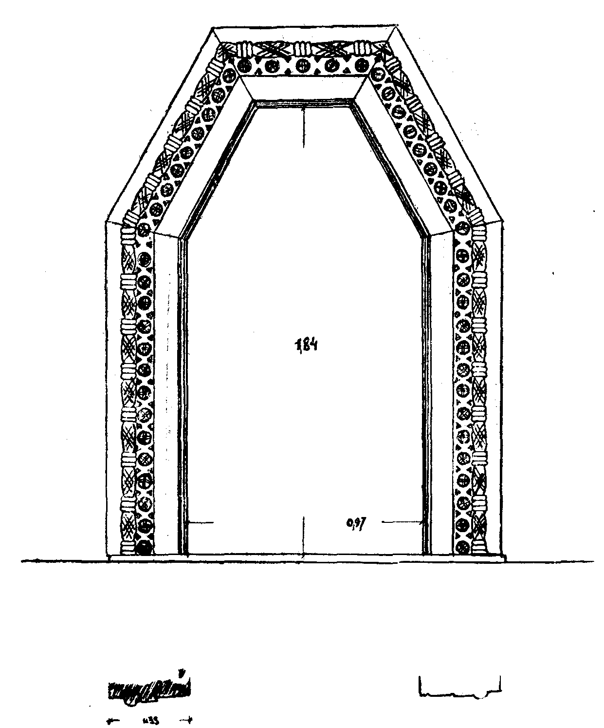 ДверіРозмір зображення: 1241:1494 піксел Двері церкви в Вінниці. Обмір П. Юрченка. Джерело: Юрченко П.Г. Дерев’яне зодчество України. – К.: 1949 р., с. 115. |