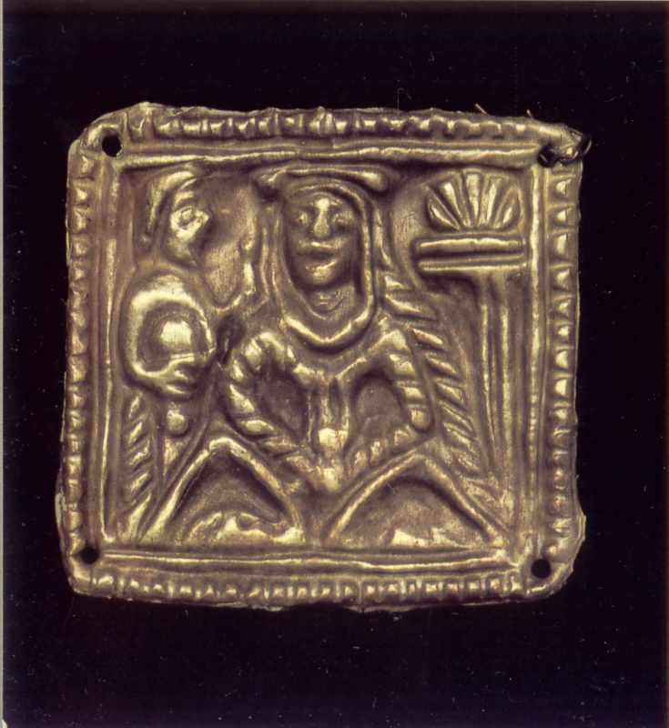 Пластина від жіночого одягу з ритуальною сценою возлияння: скіф п’є священне вино перед богинею.