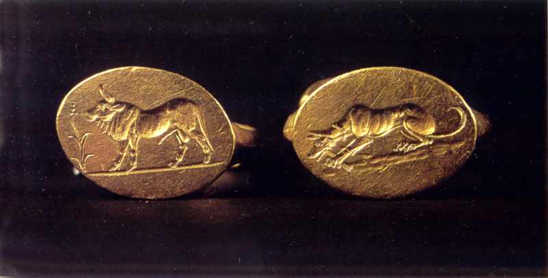 Перстеневі печатки з перекритими, але нез’єднаними кінцями. На гранях вигравійовані бик та собака, яка гризе кістку.