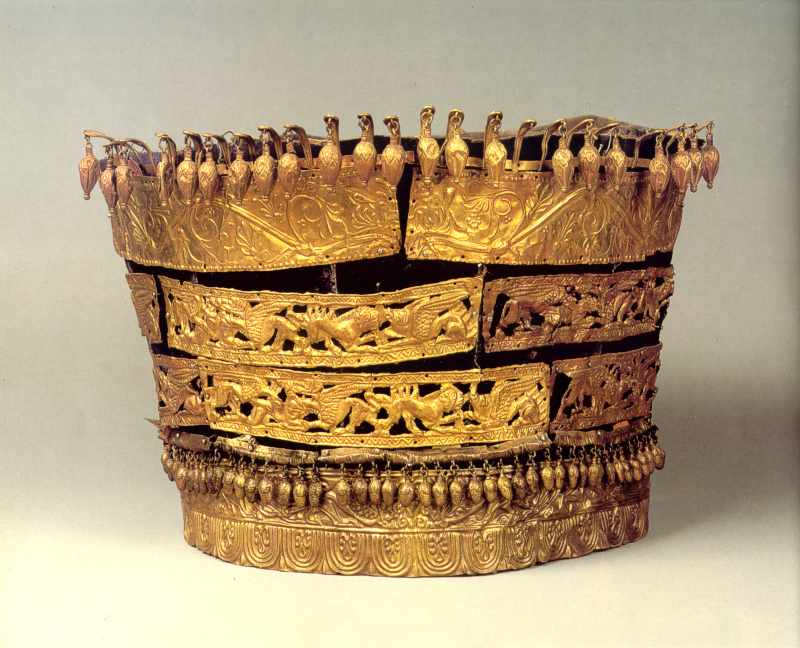 Ритуальний головний убір знатної скіфянки (реконструкція). Золоті платівки, які були нашиті на тканини або шкіру, прикрашені рельєфами з рослинним орнаментом, сценами боротьби тварин, левами, грифонами, птахами, кониками і бджолами.