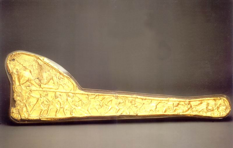 Иконография воинов-варваров включает детали, присущие в греческой изобразительной традиции как амазонкам, так и персам, в связи с чем исследователи обычно усматривали в этих сценах эпизоды истории греко-персидских войн. Не менее вероятно присутствие на ножнах сюжетов цикла о Троянской войне, ставших вновь чрезвычайно популярными во время и сразу после похода Александра Великого на Восток.