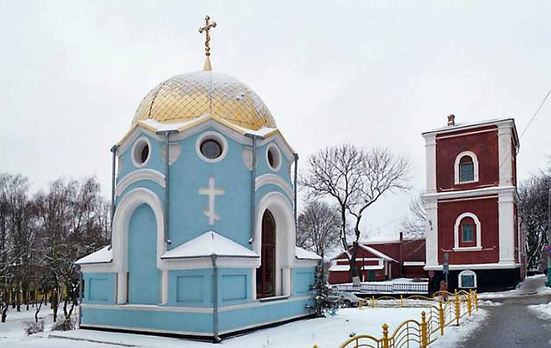 Чотирикутна кам’яна каплиця має восьмигранне завершення з арками у вигляді кокошников. Побудована вона в російсько-візантійському стилі, її купол нагадує шолом давньоруського воїна. Дзвіниця була побудована і освячена в 1888 році на честь 900-річчя православ’я на Русі.
