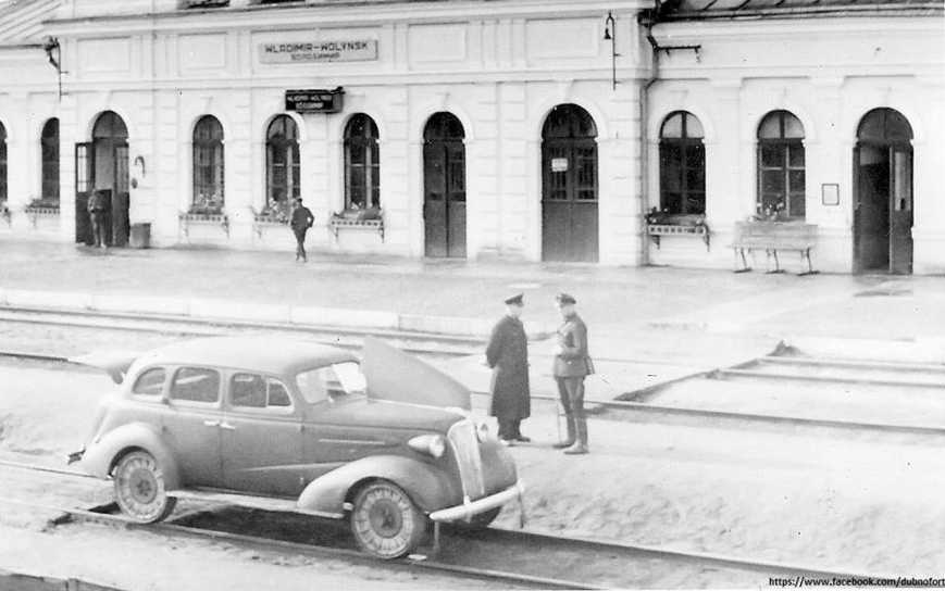 1941..1944 рр. Фрагмент залізничкого вокзалуРозмір зображення: 869:544 піксел Фото з альбому «Дубенський форт-застава» На передньому плані – німецький автомобіль, що рухався по рейках (мотодрезина). |