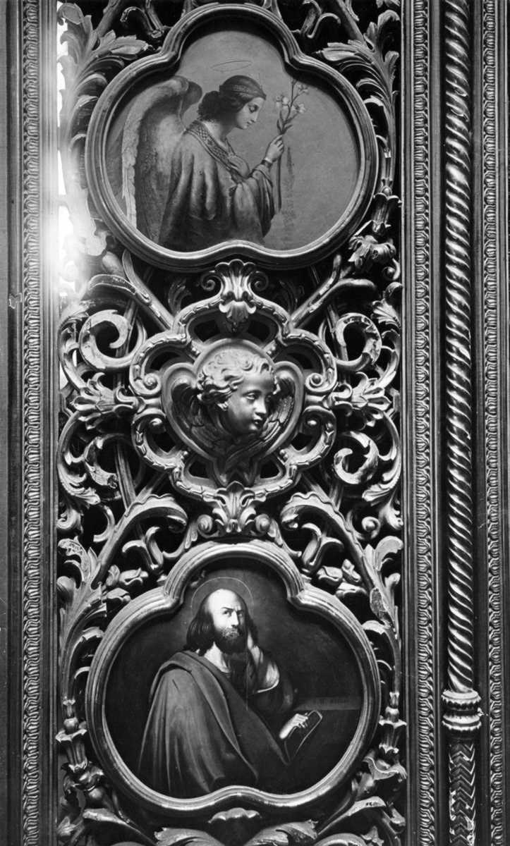 Врата з порцеляни. Вгорі – архангел Гавриїл (ліва частина композиції «Благовіщення»), нижче – хтось із євангелістів