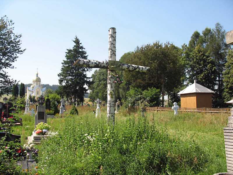 Цвинтар Розмір зображення: 800:600 піксел Фото Зенона Боровця і Богдана Тхора, 8 серпня 2008 р. Вкладені елементи 2008 р. Фрагмент брами 8-кінцевий різьблений хрест Могила І. Голода
