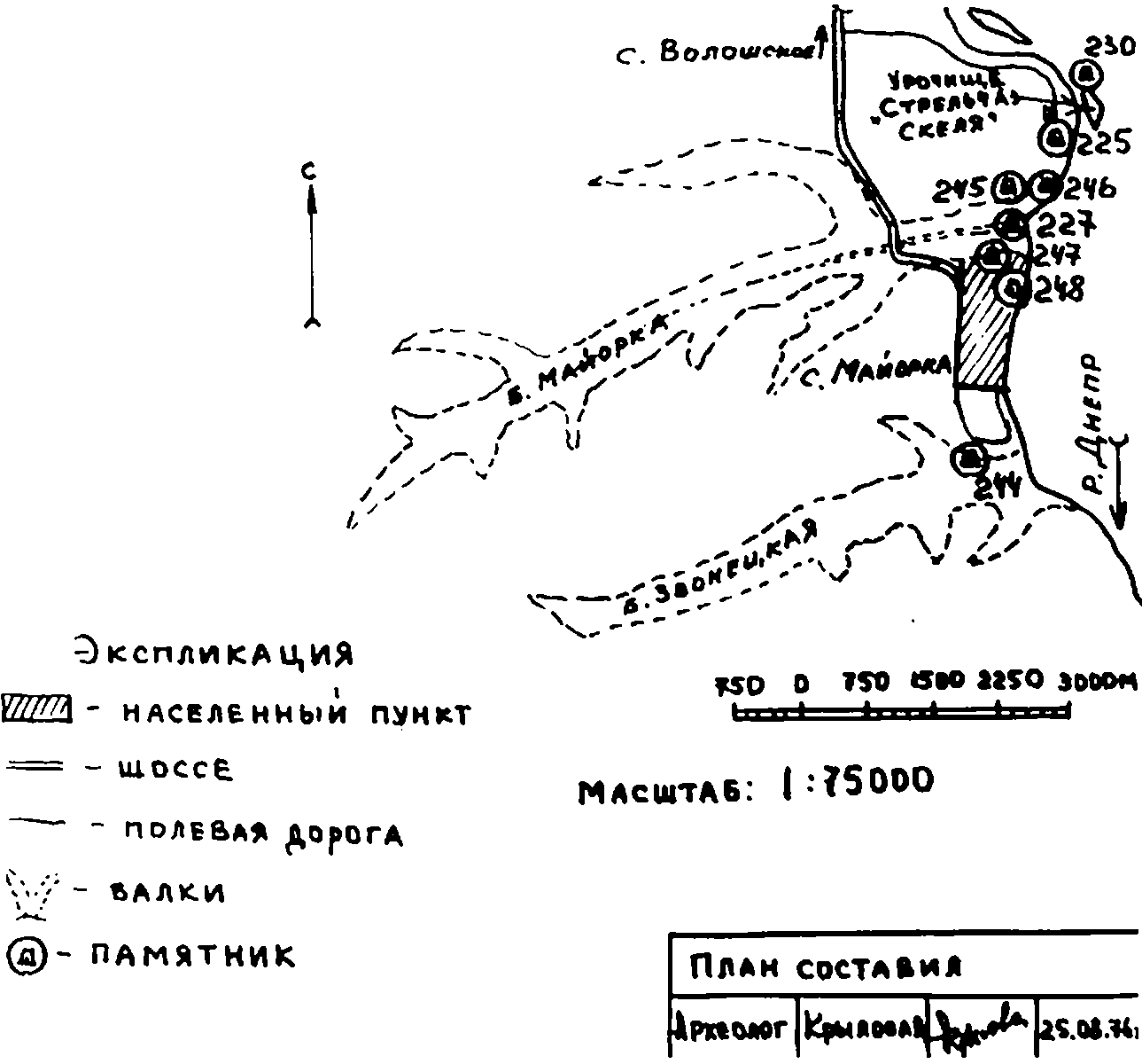 Дніпропетровська обл., Дніпропетровський район, Волоська сільрада, с. Волоське, за 2 км на південь від села, на березі Дніпра, недалеко від балки “Майорки”.