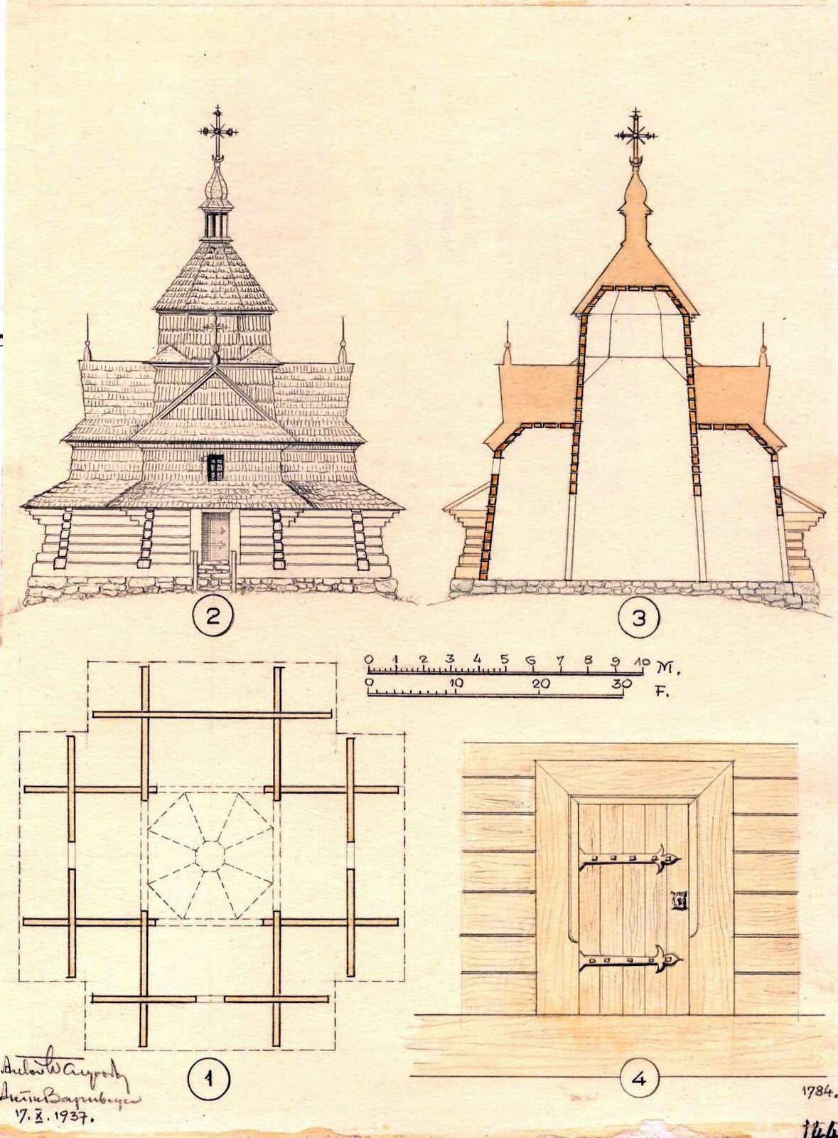 1937 р. План, переріз, фасад, детальРозмір зображення: 1179:1600 піксел Рисунок Антона Вариводи (Краків), 17.10.1937 р. 1784 Church, Vorokhta (Worochta), Ukraine. 1 – Ground plan; 2 – West elevation; 3 – cross section; 4 – Main entrance door. |