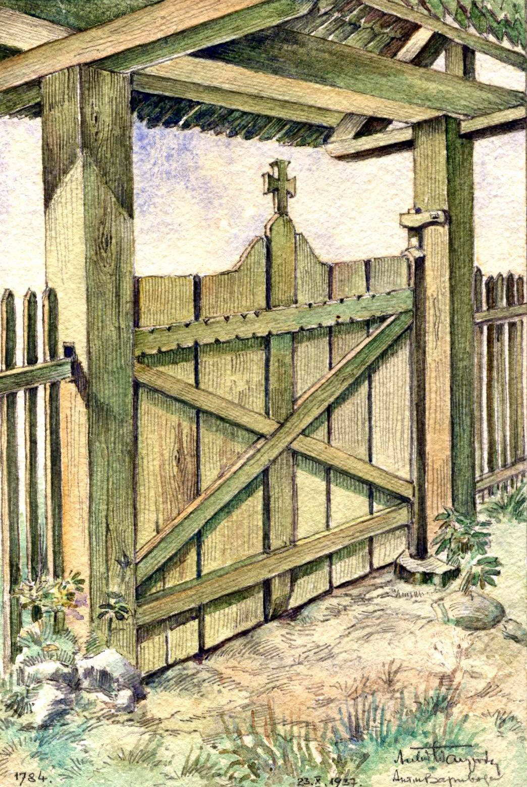1973 р. БрамаРозмір зображення: 1044:1558 піксел Рисунок Антона Вариводи (Краків), 23.10.1937 р. 1784 Church, Vorokhta (Worochta), Ukraine. Main entrance gate and wooden fence. |