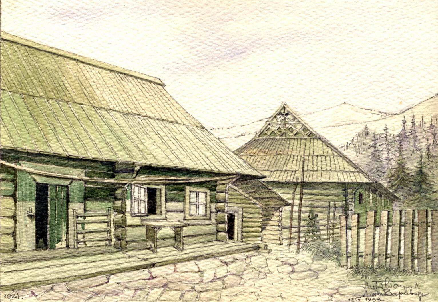 1938 р. Хата. Фрагмент чільного фасадуРозмір зображення: 1532:1057 піксел Рисунок Антона Вариводи (Краків), 12.05.1938 р. 1924 Dwelling, Vorokhta (Worochta), Nadvirna, Ukraine. Southern (front) view. |