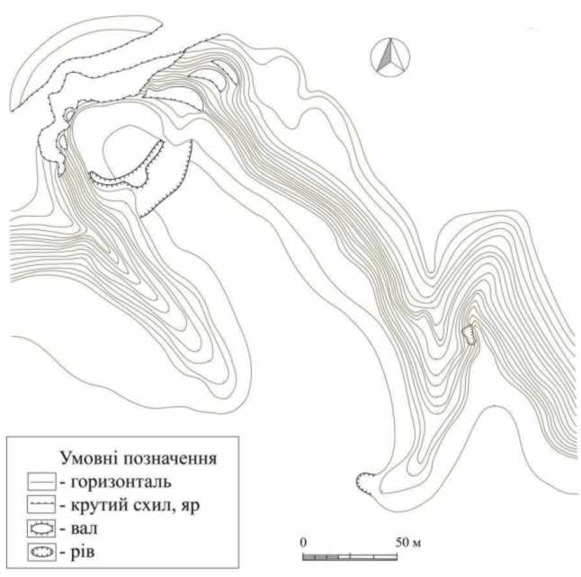 ГородищеРозмір зображення: 646:642 піксел План городища і посаду біля с. Ворожба Із книги: Осадчий Є. М. Літописні міста Південної Сіверщини. – Харків: 2023 р., с. 107. |