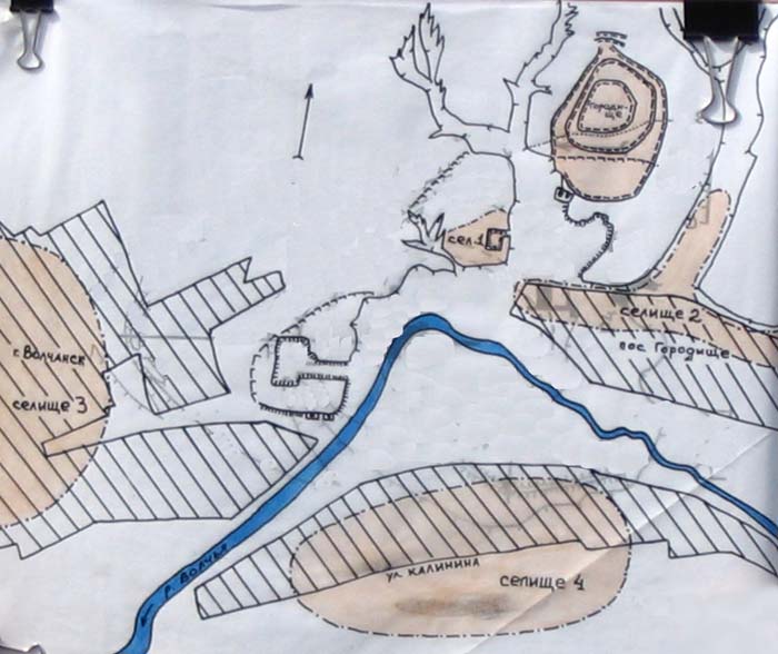 Первая и вторая линии укреплений северной части городища, по центру - археологический раскоп