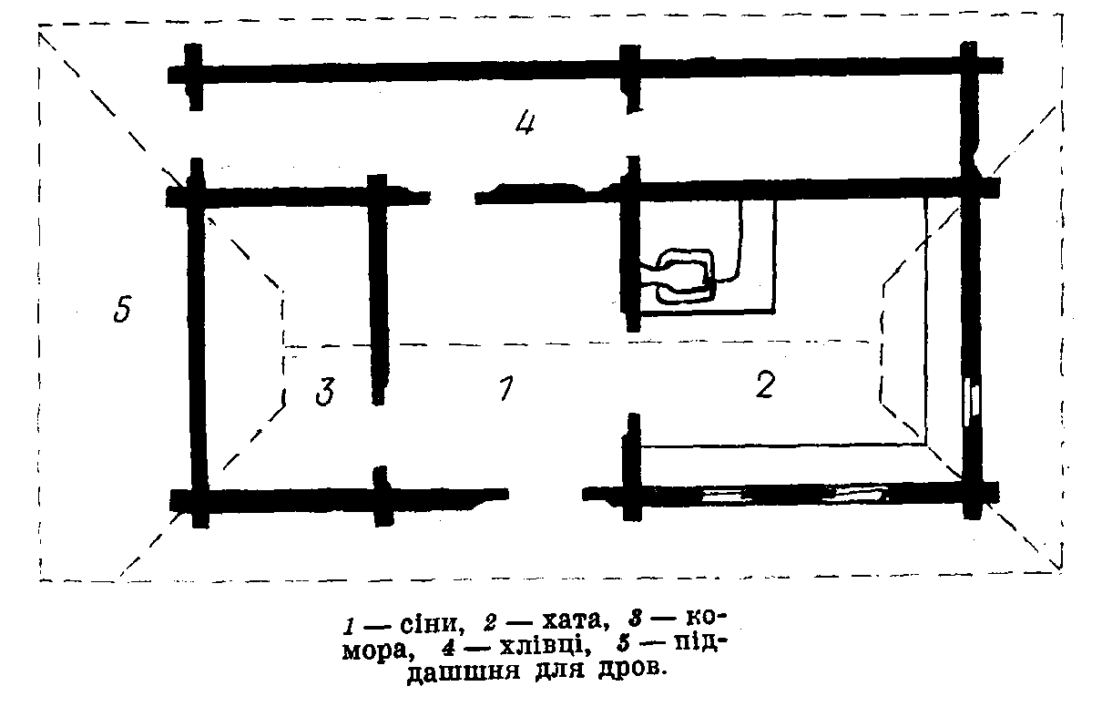 План Розмір зображення: 1210:787 піксел 1 – сіни, 2 – хата, 3 – комора, 4 – хлівці, 5 – піддашшия для дров. Попередня сторінка | Вище | Наступна сторінка