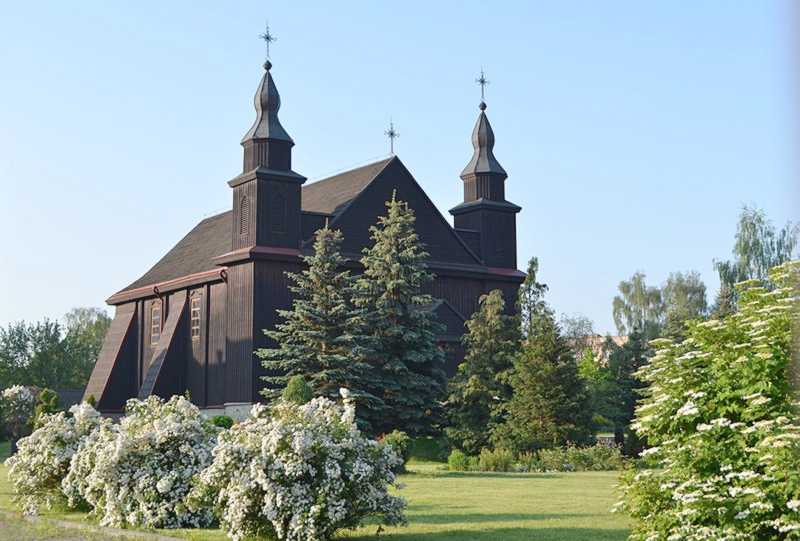 КОСТЕЛ, 1771 г. Один из двух деревянных костелов, сохранившихся не Украине (второй – в с. Тадани Львовской обл., XVII в.). Деревянный, трехнефный, с нартексом и двумя трехъярусными башнями на главном фасаде. Боковые фасады укреплены каркасными контрфорсами. Башни завершены луковичными главками. Перекрытие плоское, снаружи – двускатная крыша. Срубы обшиты вертикально досками с нащельниками, не имеют каменного фундамента. План и объемно-пространственная структура решены по принципу каменных костелов.