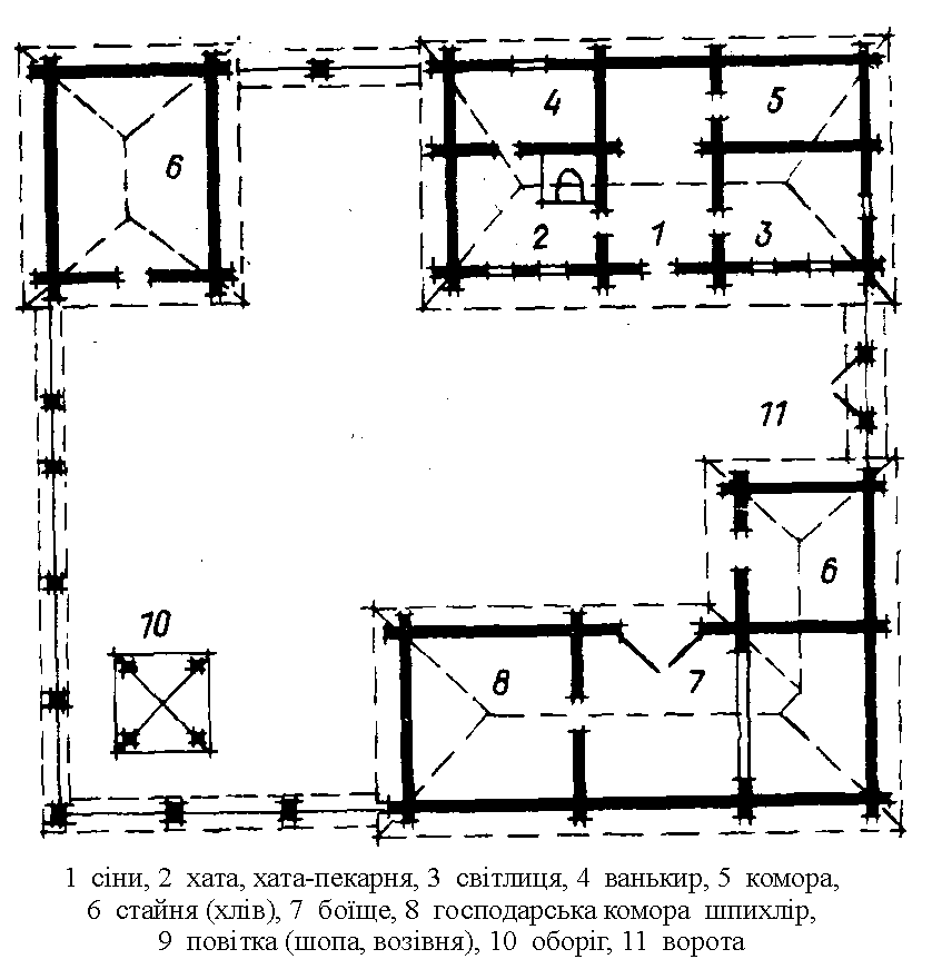 1 – сіни, 2 – хата, хата-пекарня, 3 – світлиця, 4 – ванькир, 5 – комора, 6 – стайня (хлів), 7 – боїще, 8 – господарська комора – шпихлір, 9 – повітка (шопа, возівня), 10 – оборіг, 11 – ворота.