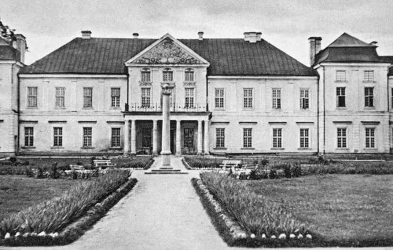 1930-і рр. (?) Головний фасад. Вигляд з півночіРозмір зображення: 800:509 піксел Фото невідомого часу (1920 – 30-х рр.?) опубліковано на сторінці «Мандрівка старим кордоном» 10.02.2022 р. Зверніть увагу на колону в центрі двора. |