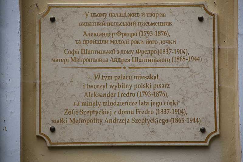 Напис: «У цьому палаці жив і творив видатний польський письменник Александер Фредро (1793 – 1876), та пройшли молоді роки його дочки, Софії Шептицької з дому Фредро (1837 – 1904), матері митрополита Андрея Шептицького (1865 – 1944)».