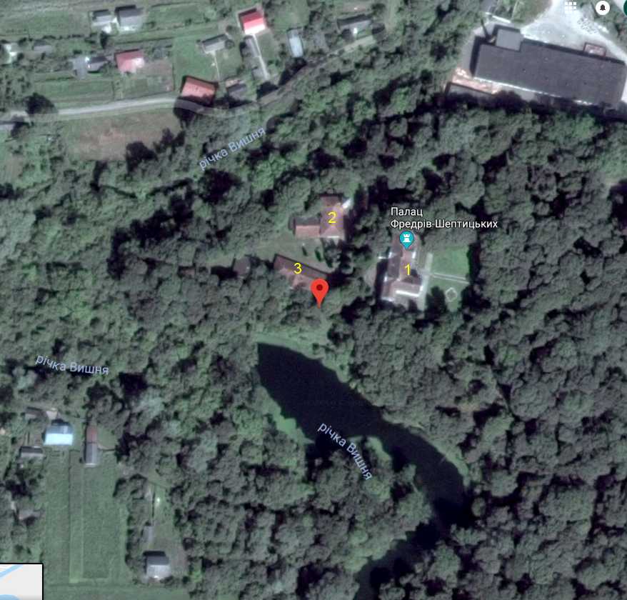2018 р. Космічне фото GoogleРозмір зображення: 878:840 піксел 1 – палац; 2 – флігель з баштою (2-поверховий); 3 – господарська споруда (1-поверхова). Місце на карті Google: |