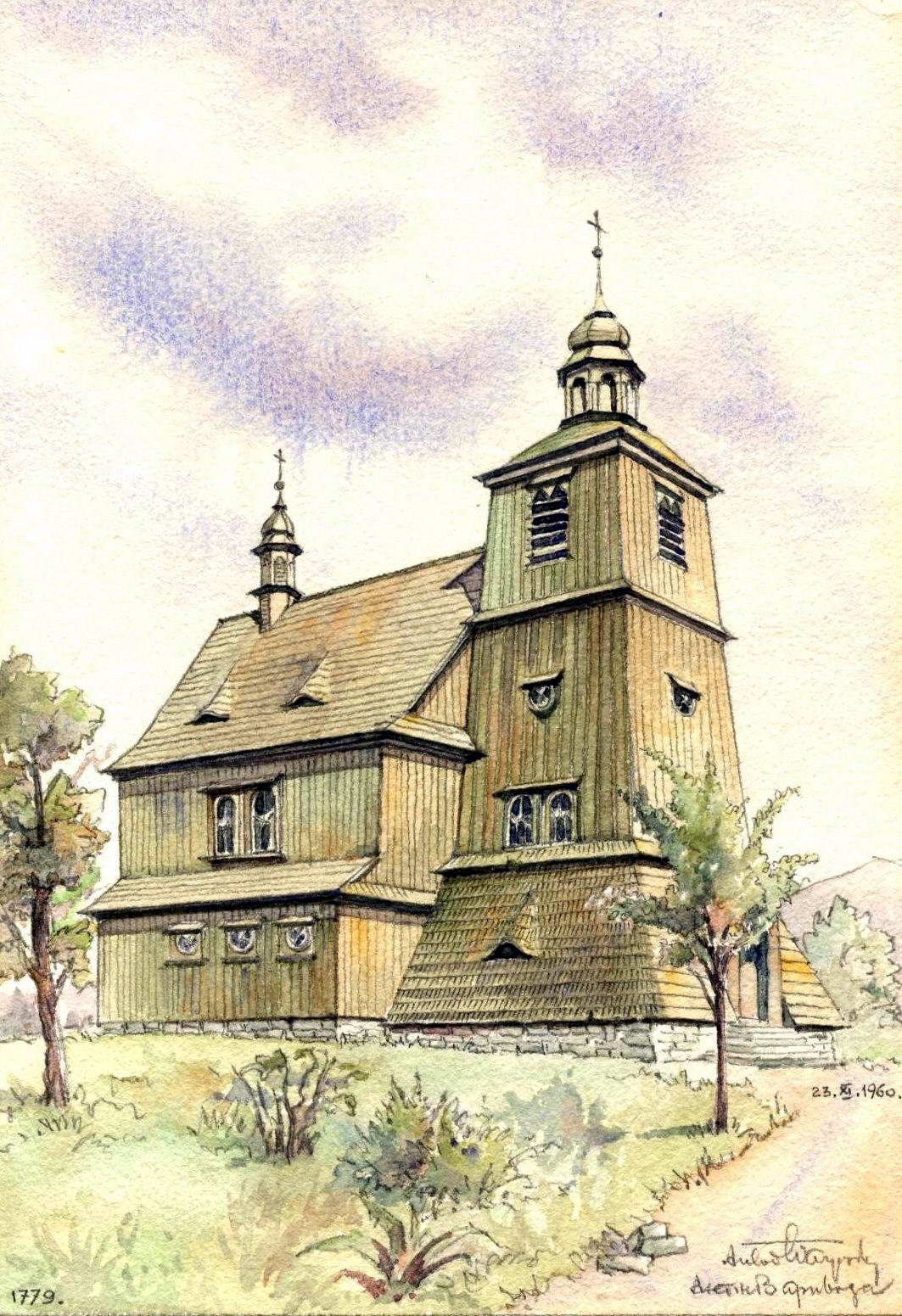 1960 р. Загальний вигляд з позиції А4Розмір зображення: 1063:1551 піксел Рисунок Антона Вариводи (Краків), 23.11.1960 р. 1779 Church, Vysova (Wysowa), Gorlice, Poland. Northwestern view. |