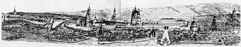1787 р. Вигляд міста з заходу. ЛітографіяРозмір зображення: 800:158 піксел Джерело: Прогулки по Харькову. – Харьков: 2004 г., с. 10 – 11. Дуже подібний з 1787 р. є на плані Харківського намісництва. |