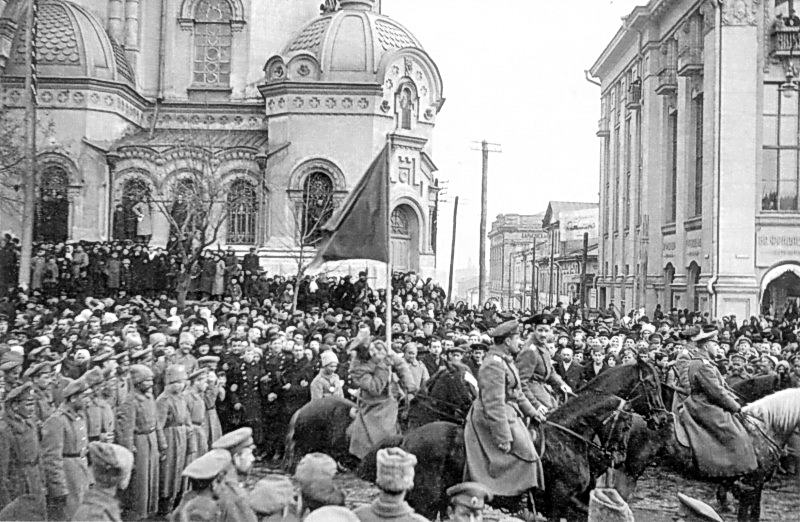 1917 р. Мітинг біля Миколаївської церквиРозмір зображення: 800:522 піксел Фото з заходу; справа – вул. Миколаївська (Короленка). Джерело: Прогулки по Харькову. – Харьков: 2004 г., с. 36. |
