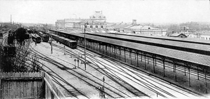 1907 р. Залізничні колії і вокзалРозмір зображення: 800:379 піксел Джерело: Прогулки по Харькову. – Харьков: 2004 г., с. 121. |