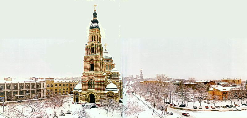 1999 р. Панорама з заходуРозмір зображення: 800:383 піксел Джерело: Прогулки по Харькову. – Харьков: 2004 г., с. 104 – 105. |