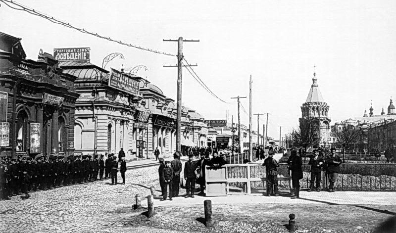 Зліва – фрагмент павільйону панорами “Голгофа” (живопис Фроша та Пігелгейма). На фото – екскурсія військових. В 1915 р. павільйон переобладнано під кінематограф “Маяк”.