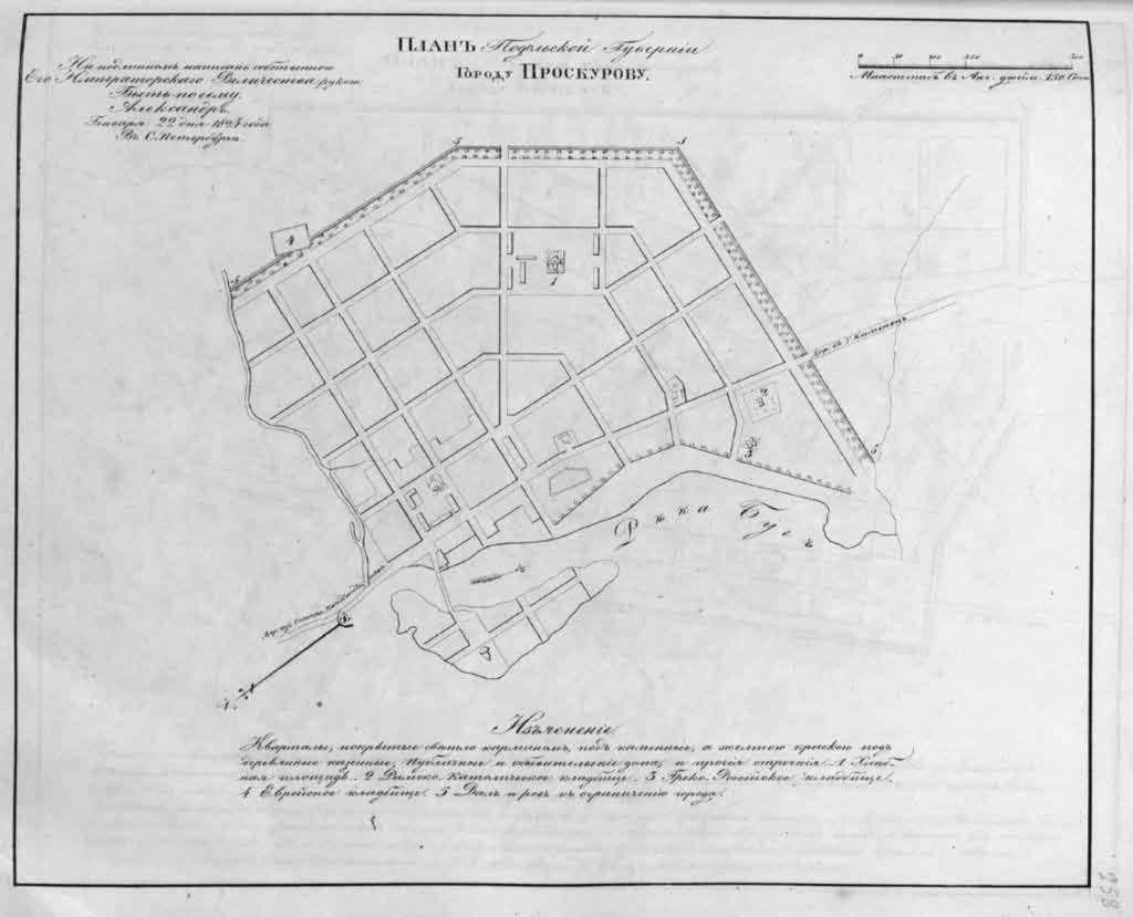 План місту Проскурову, 1824 р.Розмір зображення: 1024:829 піксел Джерело: Звід пам’яток історії та культури України. Хмельницька область. . – Хмельницький: 2019 р. |