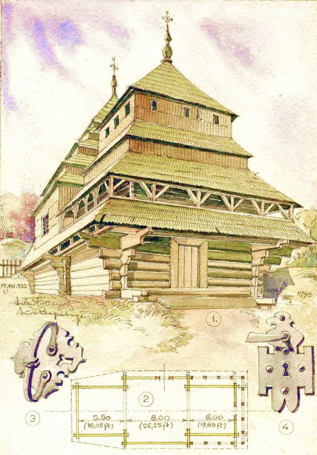 Джерело: Січинський В. Деревяні дзвіниці і церкви Галицької України XVI – XIX ст. – Льв.: 1925 р., с. 7 – 8.