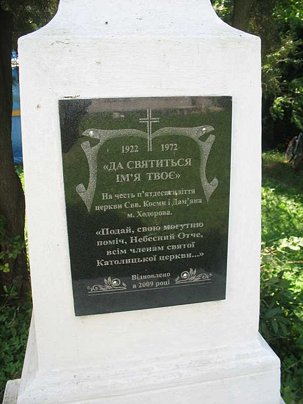 Напис: «1922 – 1972. Да святиться ім’я твоє. На четь п’ятдесятліттяцеркви св. Косми і Дам’яна м. Ходорова. Подай свою могутню поміч, небесний отче, всім членим святої католицької церкви… Відновлено в 2009 році».