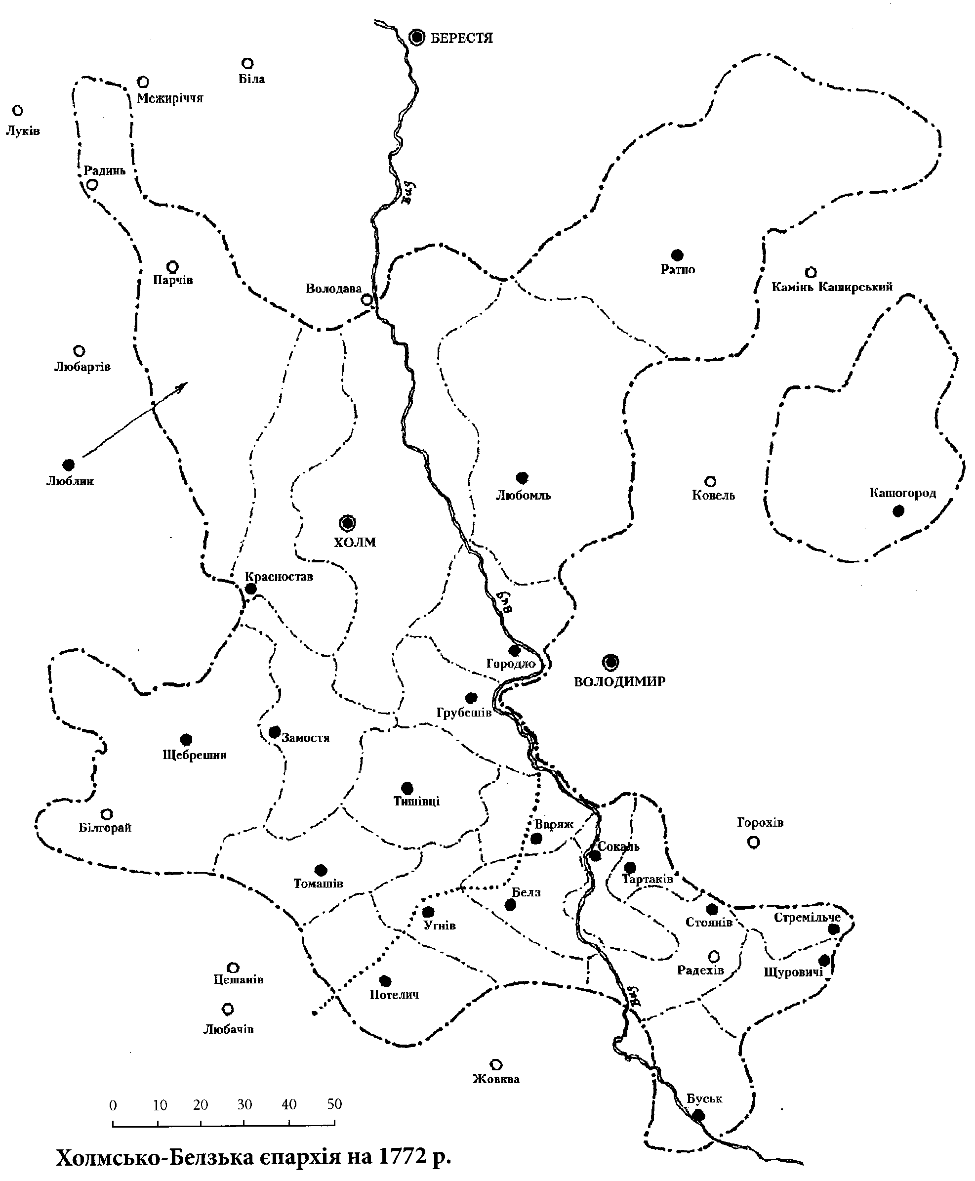 Холмсько-Белзька єпархія на 1772 р.Розмір зображення: 1974:2390 піксел Джерело: Слободян В. Церкви Холмської єпархії. – Львів: Наукове товариство ім. Шевченка, 2005 р., с. 18. |
