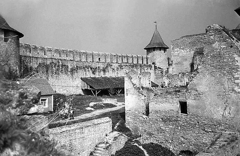 1985 р. Фрагмент західного муру і казарми. Вигляд з південного сходуРозмір зображення: 800:522 піксел 1985 р. 18 травня. Фото М.І.Жарких. Негатека, № 284-15. |