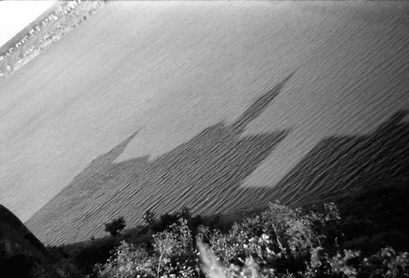 1991 р. Тінь від замку на поверхні Дністровського водосховища. Вигляд з південного заходу