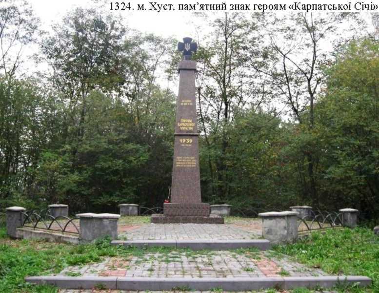 Пам’ятний знак героям «Карпатської Січі», 2009 (іст.). На вершині Замкової гори у лівій частині від дороги, що веде до міського кладовища, в гущавині лісу. Встановлений на кошти громади м. Хуста 15 березня 2009 для увіковічнення пам’яті відважних оборонців краю, які полягли захищаючи м. Хуст і його околиць від угорських окупантів у 1939.