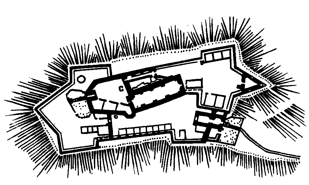 План Хустского замка. XVIII в.Розмір зображення: 1009:605 піксел [Поп И.И., Поп Д.И. В горах и долинах Закарпатья. – М.: Искусство, 1971 г., с. 93]. |