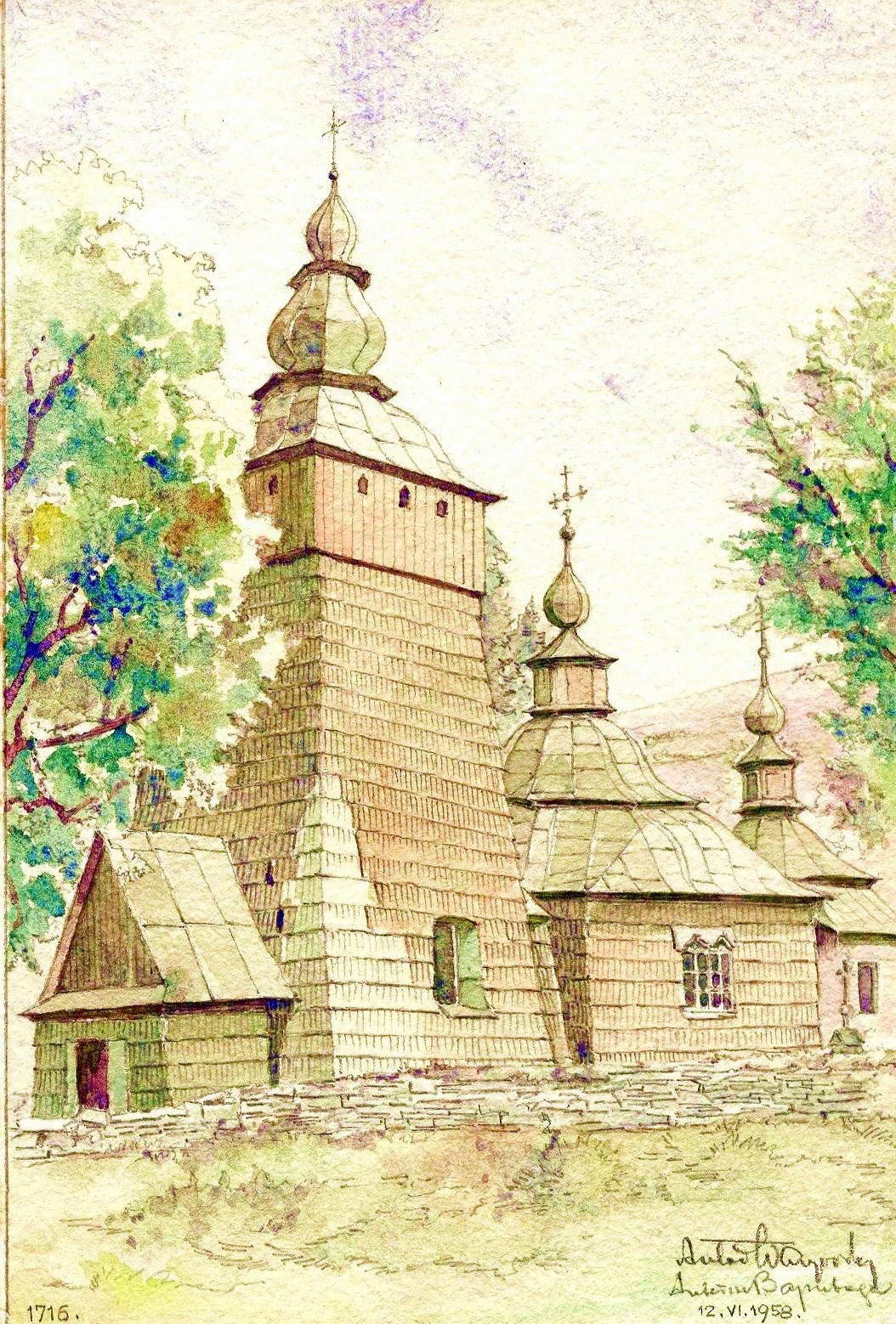 1958 р. Загальний вигляд з позиції А3Розмір зображення: 1054:1558 піксел Рисунок Антона Вариводи (Краків), 12.06.1958 р. 1716 Church, Hyrova (Hyrowa), Sanok. Southwestern view. |